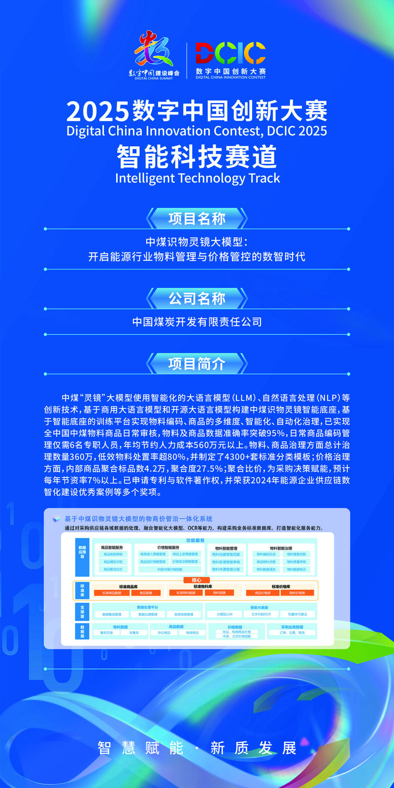 在2025數字中國創新大賽智能科技賽道中,中國中煤能源集團有限公司自主研發的“中煤靈鏡供應鏈大模型”憑借其在能源行業智能化場景中的突破性應用與技術創新,成功晉級全國總決賽。此次大賽以“以賽促研、以賽促用、以賽育人”為宗旨,吸引了全國超千支隊伍、2400余名創新人才參與,最終行業大模型賽道60支隊伍入圍總決賽。中煤靈鏡大模型作為能源領域代表,展現了AI技術與傳統產業深度融合的前沿探索。