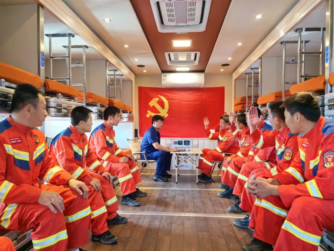 現場情況比預想更為復雜。一片汪洋,水下雜物遍布,搶險時間緊迫。中煤榆林隊布置好排澇陣地后,立即召開臨時黨支部成立后的第一次會議。狹小的車廂里,13名指戰員圍坐在一起,黨旗莊嚴地貼在車門內側,映照著每一張堅毅的面孔。